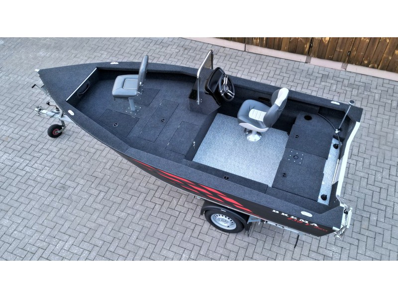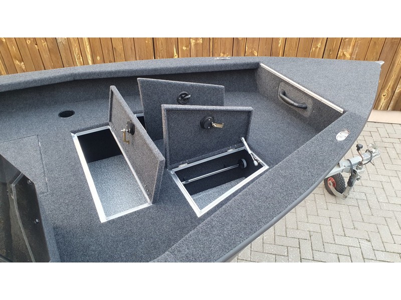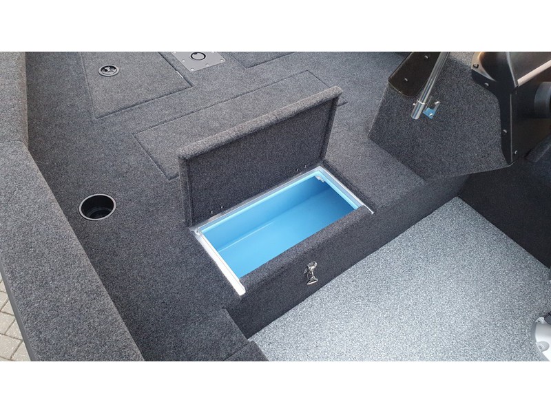 Longueur 4.75m / Largeur 1.95m / Nombre de personnes 4 Console, volant et câble de direction / Siège pilote réglable et copilote 2 embases pour siège de pêche / Serrures intégrées (avec clés) / Vivier de 47L / Éclairage led pont intérieur et Éclairage led coffres intérieurs / Pompe de cale électrique / Coupe-batterie principal / Tableau de commande électrique / Port USB et prise allume-cigare 12 V / Feux de navigation avant / Support de sonde / Échelle inox / porte-gobelets Inox.